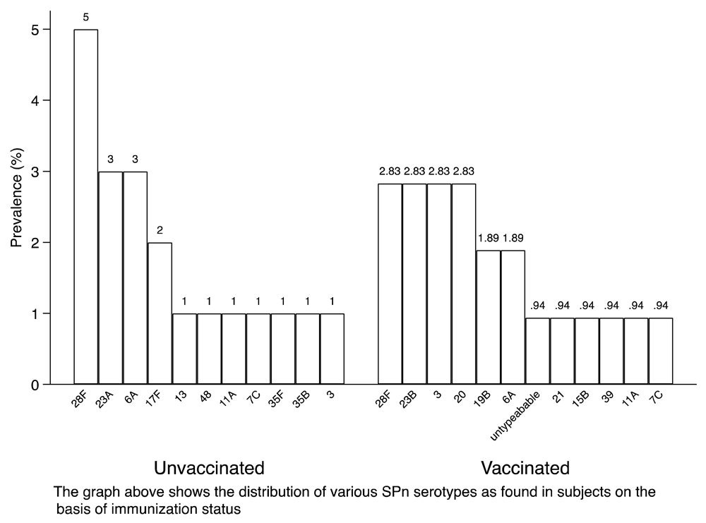 Serotypes 28F, 6A, 11A, 3 and 7C were prevalent in both vaccinated and unvaccinated children, whereas serotypes 23A, 17F, 35F, 48, 13, 35B and 23B, 20, 19B, 21, untypeable, 15B, 39 were found among unvaccinated and vaccinated groups respectively. There exists different antigenic features between and within various strains of SPn (Song et al., 2012). While the majority, if not all, pneumococcal serotypes are capable of causing disease, the frequency with which they are isolated varies (Kalin, 1998). In this case, vaccination would only be partially effective and, if so, due to inter-strain antigenic characteristics.