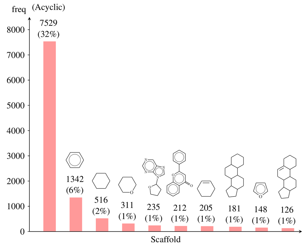 Figure 3 shows the frequency of the most common scaffolds in FooDB. Many compounds are acyclic (32%), followed by monocyclic compounds with a benzene (6%), cyclohexene (2%) and tetrahydropyran (1%) as a core structure. The benzene ring is the most common core scaffold in chemical databases used in drug discovery (Bemis & Murcko, 1996; Singh et al., 2009; Yongye et al., 2012). Many of the most frequent scaffolds in FooDB are also common in other compound databases of natural products (González-Medina et al., 2017).