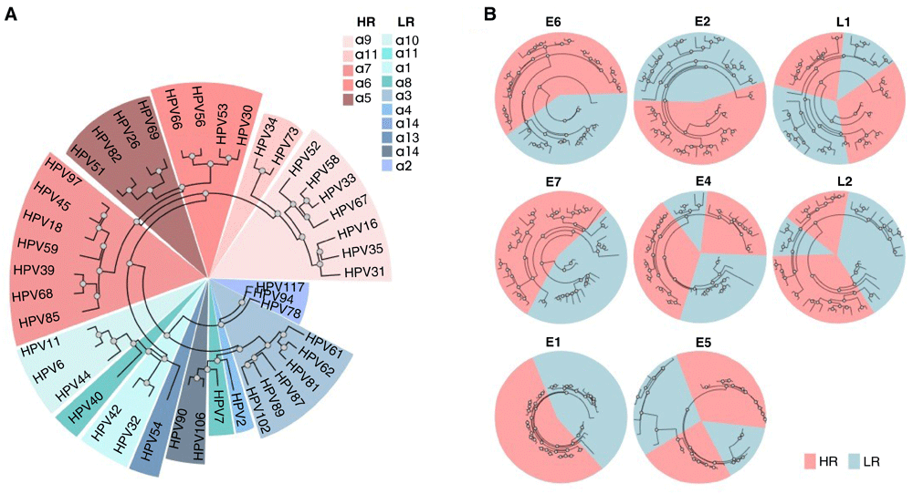The complete nucleotide sequences and the amino acid sequences of HPV E1, E2, E4, E5, E6, E7, L1 and L2 proteins were collected for all sequenced alpha-HPV strains (Extended data: Table S131). We then constructed a global multiple sequence alignment of the whole genome nucleotide sequences and the amino acid sequences alignments for each protein. Maximum likelihood phylogenetic analysis of these alpha-HPVs, based on the complete nucleotide sequence, as well as the amino acid sequences of most early proteins, identified HR-HPV as a clade, whereas phylogenies of E4, E5, L1 and L2 did not support the monophyly of the HR-HPV (Figure 1; Extended data: Figure S131), in agreement with previous findings9,10. These observations are compatible with a major role of recombination in the HPV evolution.
