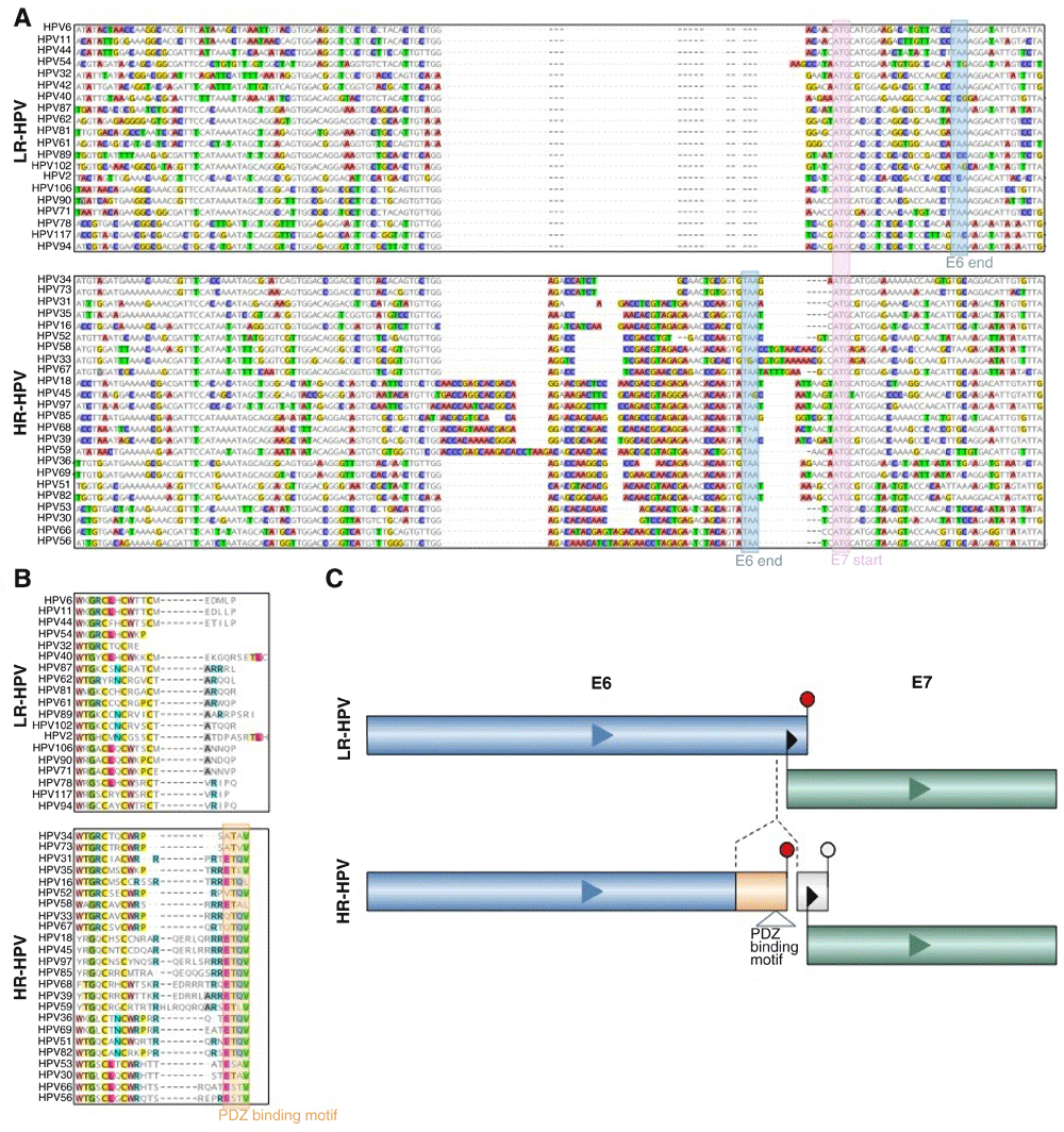 (A) Nucleotide sequence alignment of alpha-HPVs (upper panel are LR-HPV and lower panel are HR-HPV sequences). Boxed sequences: pink box, E7 start codon for most HPV types; blue boxes, E6 stop codons that are distinct between HR-HPV and LR-HPV. (B) Amino acid sequence alignment of alpha-HPVs (upper panel are LR-HPV and lower panel are HR-HPV sequences). The orange box shows the PDZ-binding motifs in E6 of HR-HPV. (C) Schematic representation of the E6/E7 separation through the insertion in E6 and the proximity of E6 stop and E7 starts in HR-HPV.