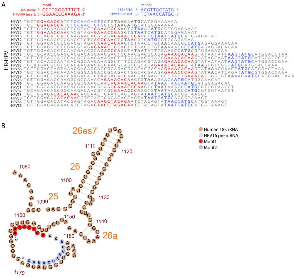 (A) Comparison of 18S rRNA complementary sequences for different HR-HPV strains. The distal and proximal to the E7 start motifs (motifs 1 and 2) to the E7 start codon are shown in red and blue, respectively. The E6 stop codons (TAA) and E7 start codons are marked in bold. (B) An illustration of the potential interactions between folded HPV16 pre-mRNA (grey, red and blue) and the human 18S rRNA (brown). The two motifs are marked on the HPV-structure in red (motif 1) and blue (motif 2).