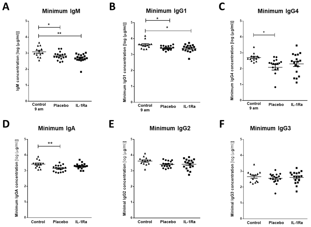 (A) Minimum IgM concentration measured in the first seven days after stroke was lower in both placebo and IL-1Ra treated patients in comparison to healthy controls. Data show mean ±SD, * P<0.05, ** P<0.01, one-way ANOVA with Bonferonni correction. (B) Minimum concentration of IgG1 and measured in the first seven days after stroke was reduced in both placebo and IL-1Ra treated patients in comparison to healthy controls. Minimum IgG4 (C) and IgA (D) concentrations were reduced in placebo-treated stroke patients in comparison to healthy controls. There was no significant difference between placebo-treated and IL-1Ra-treated stroke patients. No significant difference in IgG2 (E) and IgG3 (F) concentration was detected between placebo-treated and IL-1Ra-treated stroke patients in comparison to healthy controls. Data show mean ±SD, * P<0.05; ** P<0.01; one-way ANOVA with Bonferonni correction.