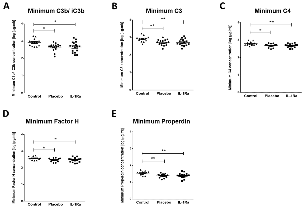 Minimum concentrations of (A) C3b/ iC3b, (B) C3, (C) C4, (D) Factor H and (E) Properdin were measured in the first seven days after stroke were reduced in both placebo and IL-1Ra treated patients in comparison to healthy controls. Data show mean ±SD, * P<0.05; ** P<0.01; one-way ANOVA with Bonferonni correction.