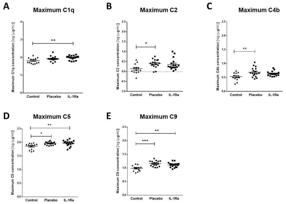 Maximum concentrations of (A) C1q, (B) C2, (C) C4b, (D) C5 and (E) C9 were measured in the first seven days after stroke were increased in both placebo and IL-1Ra treated patients in comparison to healthy controls. Data show mean ±SD, * P<0.05; ** P<0.01; one-way ANOVA with Bonferonni correction.