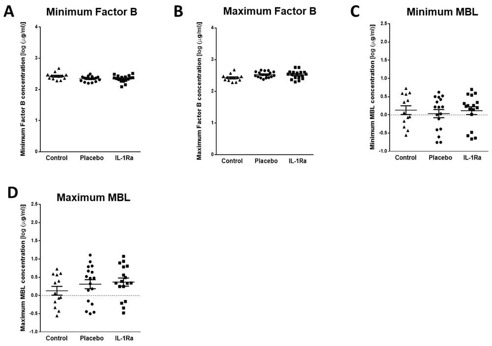 Minimal and maximum concentrations of (A, B) Factor B and (C, D) mannose-binding lectin (MBL) were measured in the first seven days after stroke were unchanged in both placebo and IL-1Ra treated patients in comparison to healthy controls. Data show mean ±SD, one-way ANOVA with Bonferonni correction.