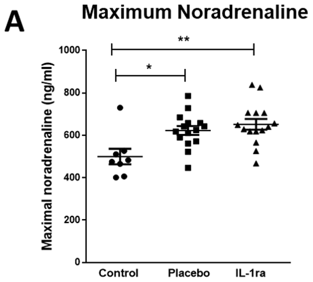 Maximal noradrenaline concentration measured in the first seven days after stroke was significantly higher in both placebo and IL-1Ra treated patients in comparison to controls. Data show mean ± SD *P<0.05; **P<0.01; one-way ANOVA.