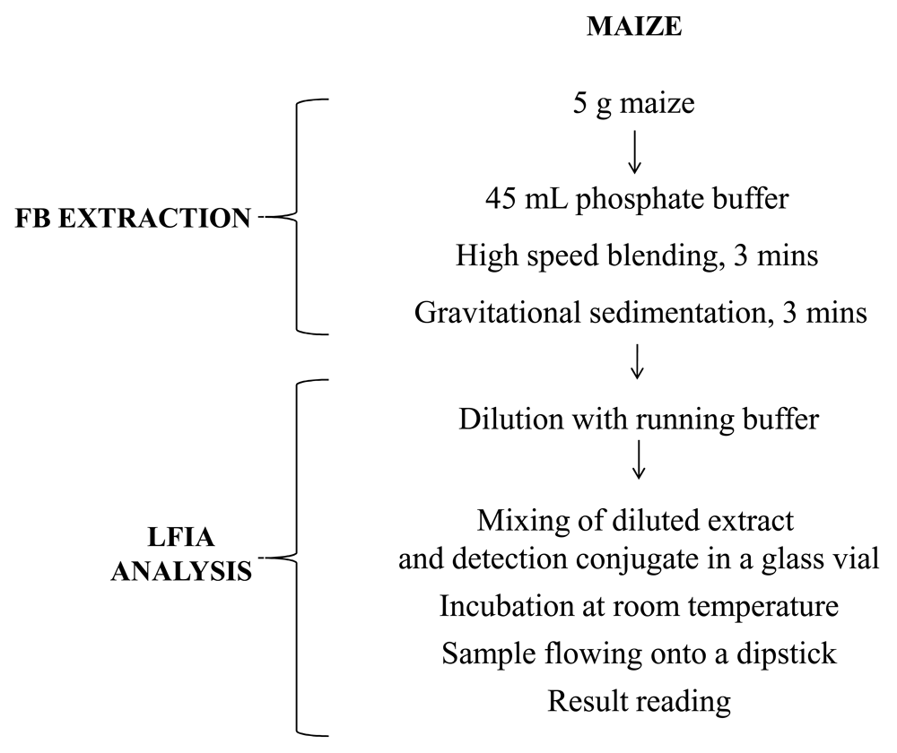 A total of 5 g of maize were homogenized in 45 mL of phosphate buffer for 3 minutes. The mixture was allowed to settle for 3 minutes before collection of the supernatant, which was further diluted in running buffer. A hundred microliters of the diluted extract were used for lateral flow immunoassays (LFIA) analysis. After being incubated with detection conjugate at room temperature, samples were flowed onto LFIA strips. Results were read with the naked eye after the strips absorbed fluid completely.