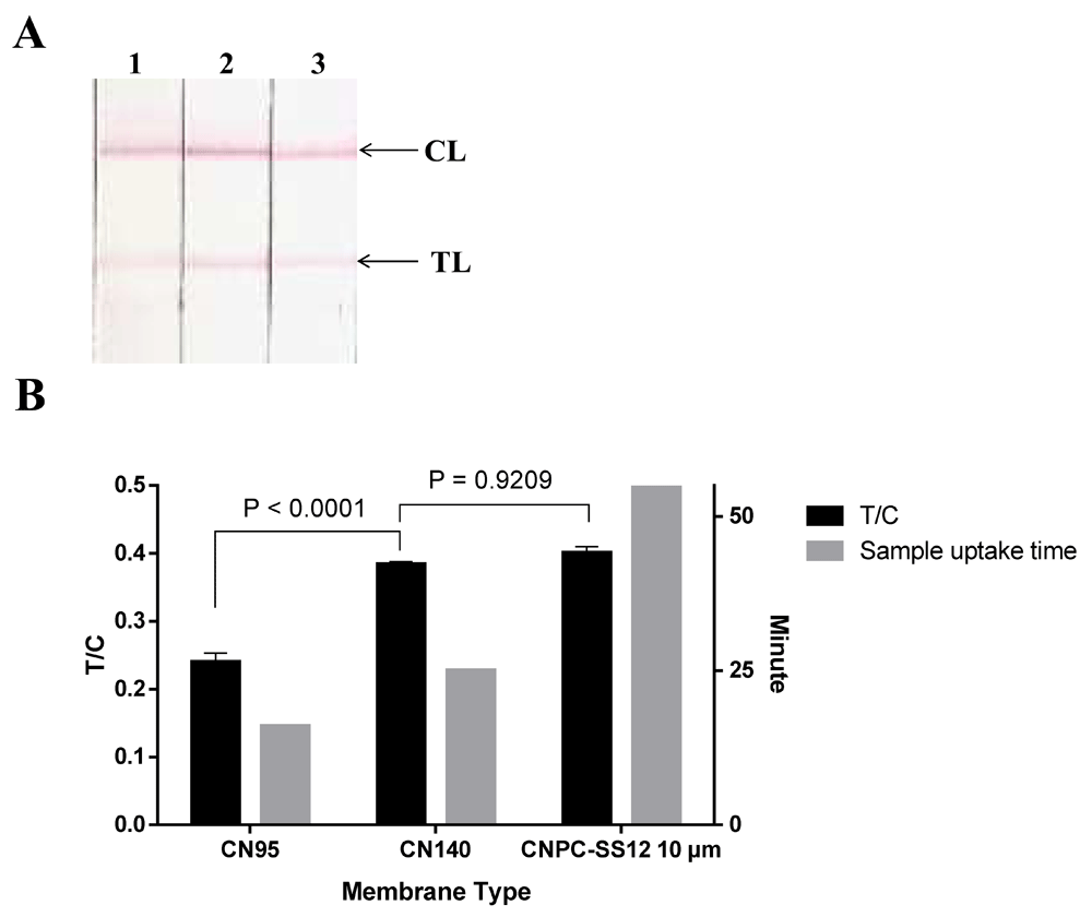 Selection of nitrocellulose membrane. Flow rate and protein-binding capacity of nitrocellulose membranes directly affect sensitivity and run time of a LFIA (O’Farrell, 2008). Generally, nitrocellulose membranes with a low flow rate will facilitate the formation of immunocomplexes at the test and control lines. However, it could lead to extended run times and false positive results (O’Farrell, 2008). In the present study, selection of nitrocellulose membrane was carried out by analyzing running buffer mixed with detection conjugate (negative controls) on three different nitrocellulose membranes. Figure 2 indicated that UniSart® CN140 (Sartorius) and CNPC-SS12, 10 μm (MDI technologies) produced higher signal intensities than UniSart® CN95 (Sartorius). Although the difference in signal intensity between UniSart® CN140 and CNPC-SS12, 10 μm was not statistically significant (p = 0.9209), sample uptake time was significantly lower on UniSart® CN140 (Figure 2B). Therefore, UniSart® CN140 from Sartorius was chosen for subsequent experiments.
