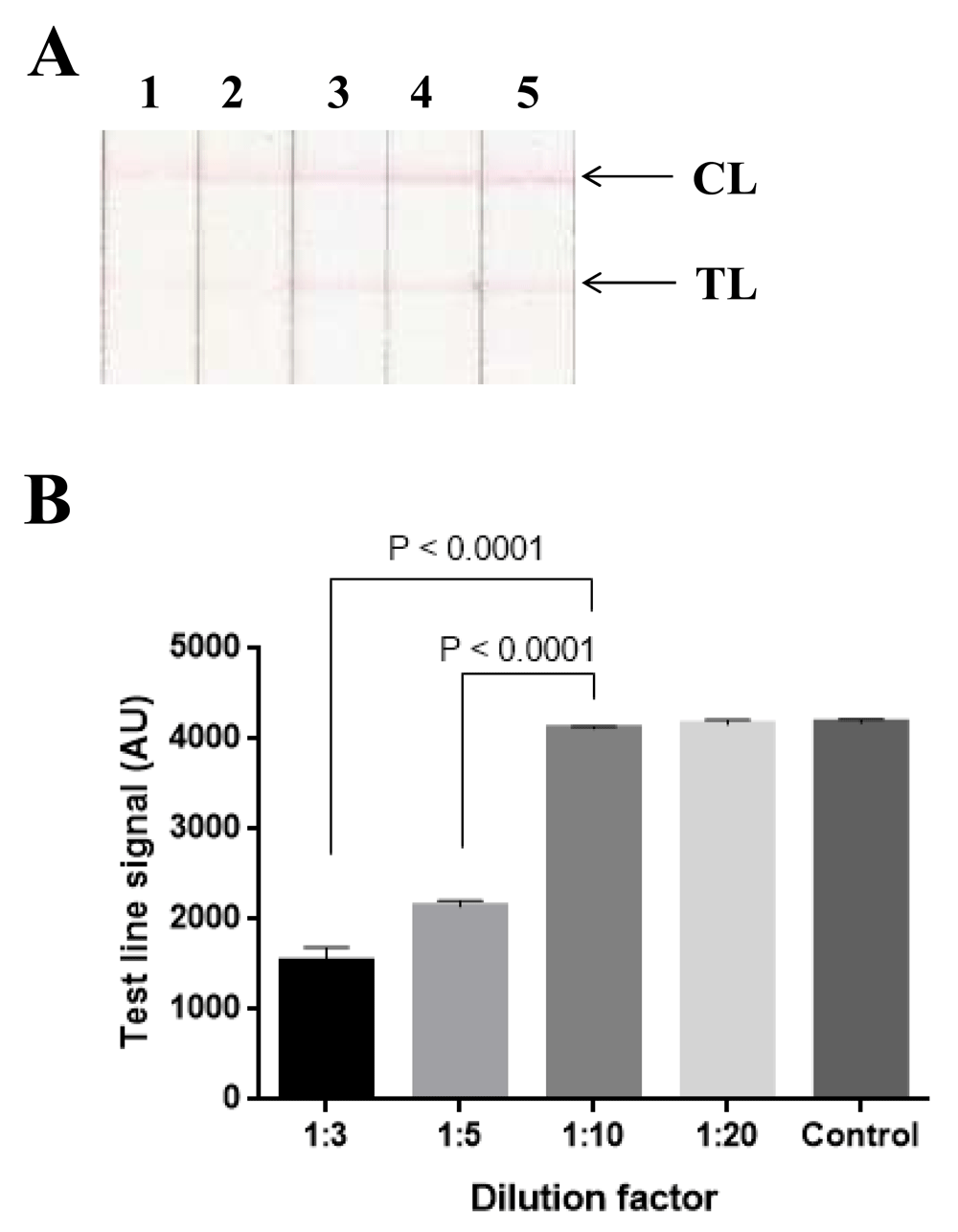 (A) Images of diluted extracts of blank maize samples (negative with fumonisin group B (FB) by high performance liquid chromatography (HPLC)) with different dilution factors on representative lateral flow immunoassay strips; 1, 2, 3, 4, maize homogenates diluted 3-, 5-, 10-, 20-fold respectively in running buffer; 5, negative controls. CL, control line; TL, test line. (B) Quantification of test line signals. Control, negative control; AU, arbitrary unit.