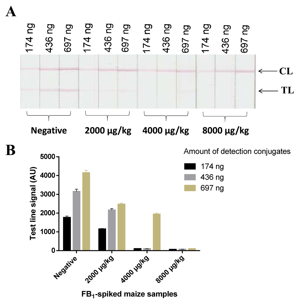(A) Images of negative controls and diluted extracts of blank maize samples spiked with FB1 at 2000 µg/kg, 4000 µg/kg, and 8000 µg/kg using 174 ng, 436 ng or 697 ng of detection conjugate on representative lateral flow immunoassay (LFIA) strips. Maize extracts were incubated with detection conjugate for one hour at room temperature before being analyzed on LFIA strips. Experiment was performed with 8 replicates. CL, control line; TL, test line. (B) Quantification of test line signals. AU, arbitrary unit.