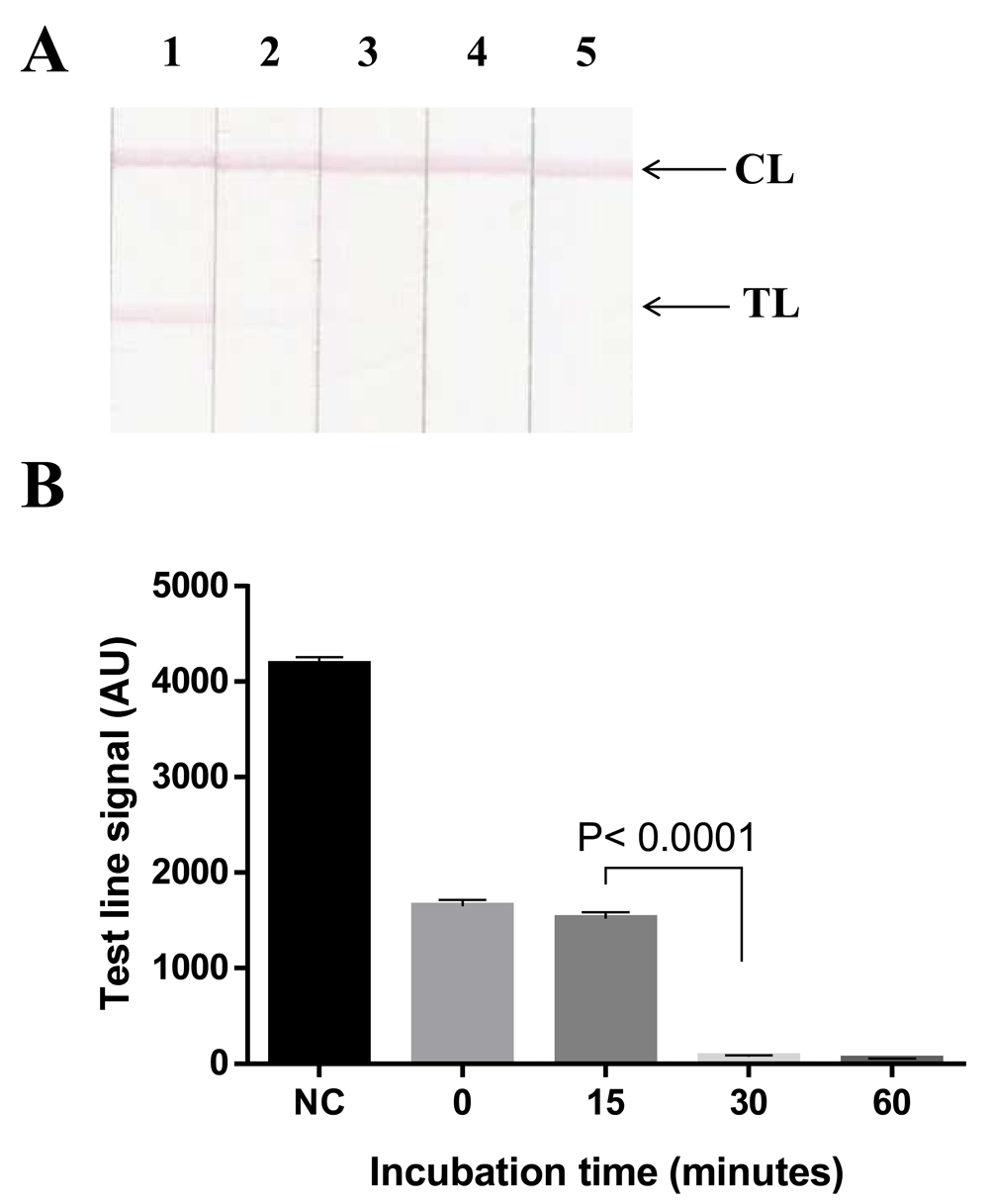 (A) Images of diluted extract (from blank sample spiked with fumonisin B1 (FB1) at 4000 µg/kg) incubated with 436 ng of detection conjugate for 0, 15, 30 and 60 minutes on representative lateral flow immunoassay strips. 1, negative control; 2, 3, 4, 5, incubation time of 0, 15, 30, 60 minutes respectively; CL, control line; TL, test line. (B) Quantification of signal intensities. NC, negative control; AU, arbitrary unit.