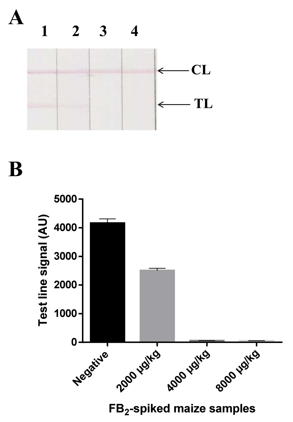 (A) Images of negative controls (1) and diluted extracts of blank maize sample spiked with FB2 at 2000 µg/kg (2), 4000 µg/kg (3), and 8000 µg/kg (4) on representative lateral flow immunoassay strips. CL, control line; TL, test line. Experiment was performed with 8 replicates. (B) Quantification of test line signals. AU, arbitrary unit.