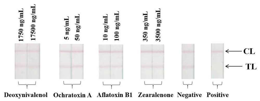 To test the specificity of the developed assay, four following mycotoxins at 100-fold and 1000-fold of MRL (deoxynivalenol at 1750 ng/mL and 17500 ng/mL; ochratoxin A at 5 ng/mL and 50 ng/mL; aflatoxin B1 at 10 ng/mL and 100 ng/mL; and zearalenone at 350 ng/mL and 3500 ng/mL) were spiked into diluted extracts of blank samples. All of these mycotoxins were purchased from FERMENTEK Ltd (Cat Nº: 51481-10-8, 303-47-9, 1162-65-8, 17924-92-4). The subsequent LFIA analyses were performed as mentioned above.