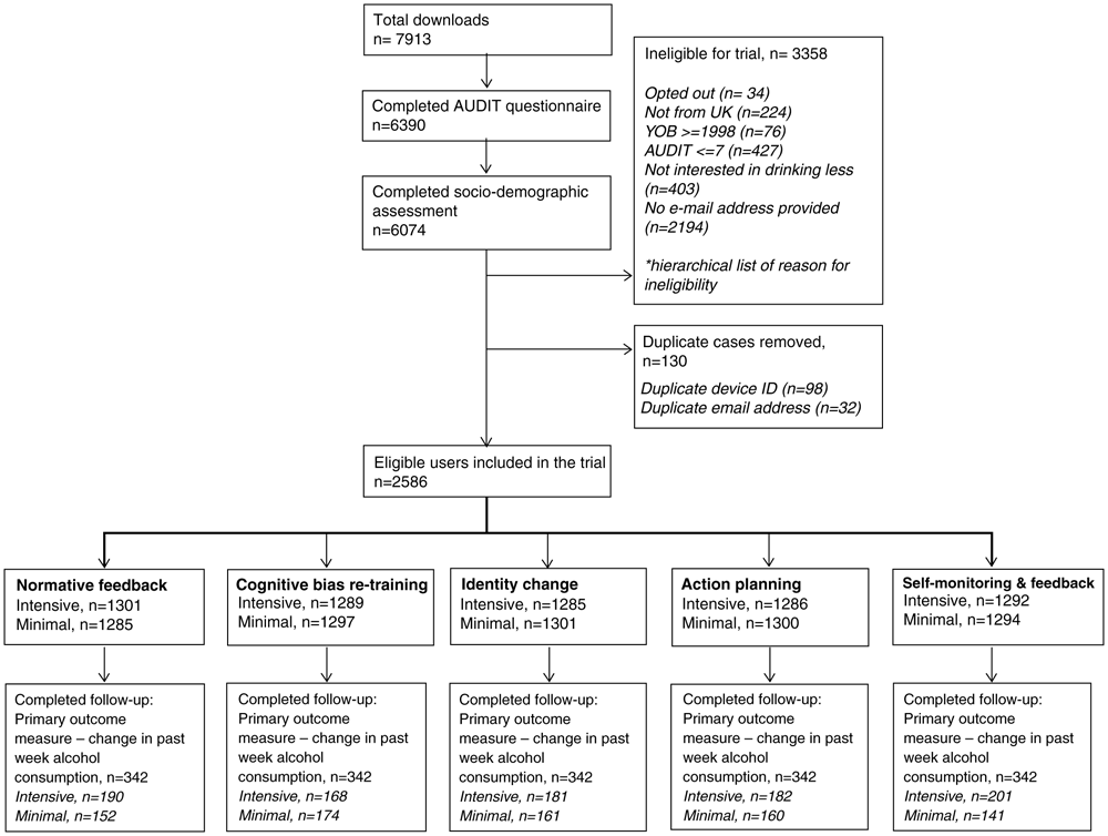 Informed consent to participate in the trial was obtained from all participants on first opening the app. Users who consented to participate completed the AUDIT and a socio-demographic questionnaire, indicated their reason for using the app and provided their email address for follow-up (a prize of £100 was offered in an attempt to decrease the proportion of users leaving this field blank). Users were then provided with their AUDIT score and, those who met the inclusion criteria, were randomised to one of 32 experimental conditions using an automated algorithm within the app for block randomisation.