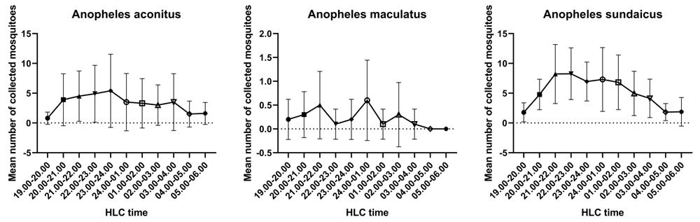 There are some limitations of the current study. There was no intervention included to measure the effectiveness of any type of protection in correlation with the different biting times in each study site. In further research, an intervention approach should be used to find the best protection strategy in locations that may have different Anopheles biting times. Additionally, our collection method was limited to three weeks observational research. A more prolonged study needs to be conducted to reflect yearly fluctuations in local Anopheles biting times.