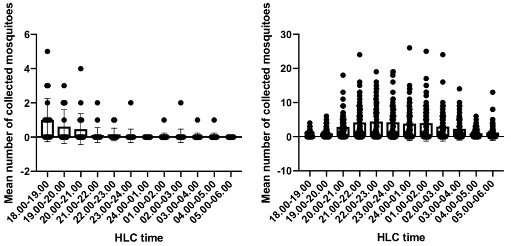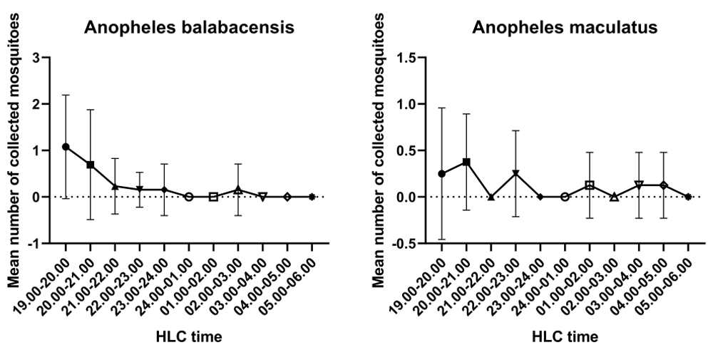 There are some limitations of the current study. There was no intervention included to measure the effectiveness of any type of protection in correlation with the different biting times in each study site. In further research, an intervention approach should be used to find the best protection strategy in locations that may have different Anopheles biting times. Additionally, our collection method was limited to three weeks observational research. A more prolonged study needs to be conducted to reflect yearly fluctuations in local Anopheles biting times.