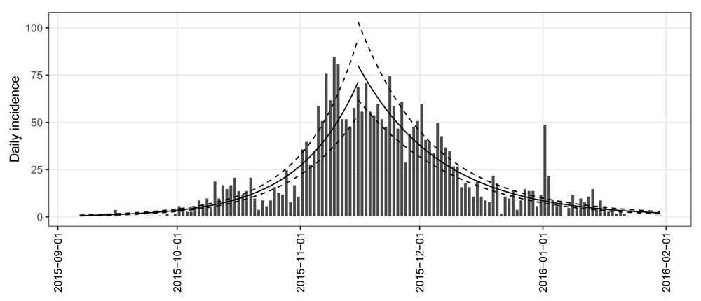 While conceptually simple, epicurves are useful in many respects. They provide a simple, visual outline of epidemic dynamics, which can be used for assessing the growth or decline of an outbreak (Barrett et al., 2016; Fitzgerald et al., 2014; Jernberg et al., 2015; Lanini et al., 2014; Nhan et al., 2018) and therefore informing intervention measures (Meltzer et al., 2014; WHO Ebola Response Team et al., 2014; WHO Ebola Response Team et al., 2015). In addition, epicurves also form the raw material used by a range of modelling techniques for short-term forecasting (Cori et al., 2013; Funk et al., 2018; Nouvellet et al., 2018; Viboud et al., 2018) as well as in outbreak detection algorithms from syndromic surveillance data (Farrington & Andrews, 2003; Unkel et al., 2012).