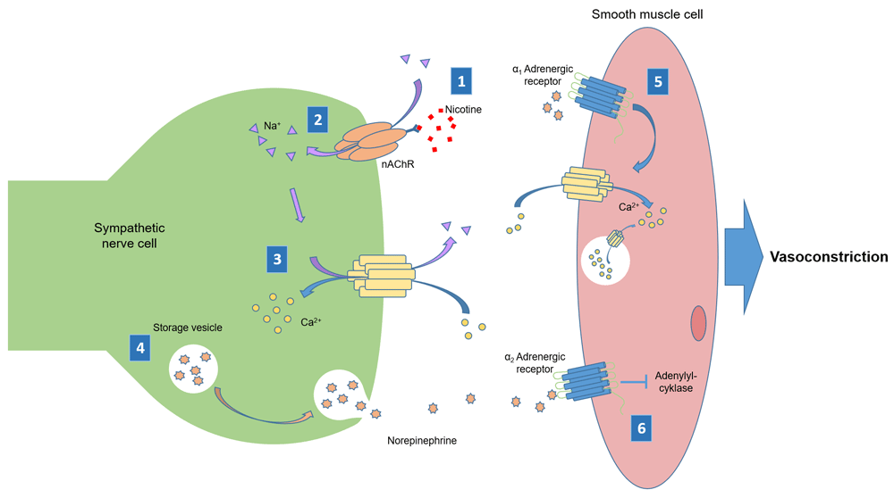 1) Nicotine binds to the nicotinic acetylcholine receptor (nAChR) causing a conformational change. 2) Sodium ions (Na+) enter the cell through the central pore of the nAChR. 3) Ion exchange leads to influx of calcium ions (Ca2+) into the cell causing depolarization. 4) Depolarization stimulates exocytosis of stored norepinephrine. 5) Norepinephrine binds to α1 adrenergic receptors on the smooth muscle cell surface, stimulating calcium ion influx and release of stored calcium. 6) Norepinephrine also binds to α2 adrenergic receptors on the smooth muscle cell surface, which causes downstream inhibition of adenylyl cyclase activity. Both these mechanisms cause smooth muscle contraction and, consequently, vasoconstriction.