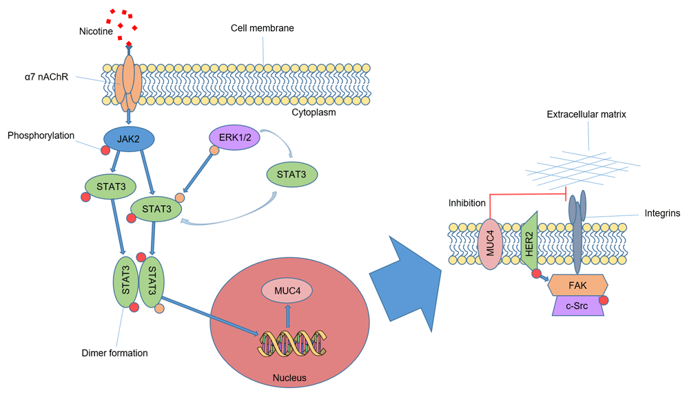 Nicotine interacts with the α7 nAChR on the cell surface, activating JAK2 and leading to the phosphorylation of STAT3. ERK1/2 mediated STAT3 phosphorylation is known to enhance DNA binding and to stabilize STAT3 in the cytoplasm. The phosphorylated forms of STAT3 join to form dimers and translocate into the nucleus where they interact with the DNA causing upregulation of MUC4. MUC4 is then expressed on the cell membrane and either directly inhibits the integration of integrins with extracellular matrix, or indirectly through HER2 activation. These pathways lead to a decrease in cell-to-cell adhesion and increase the migratory potential of pancreatic cancer cells. This figure has been reproduced with permission from Momi et al., 2013.