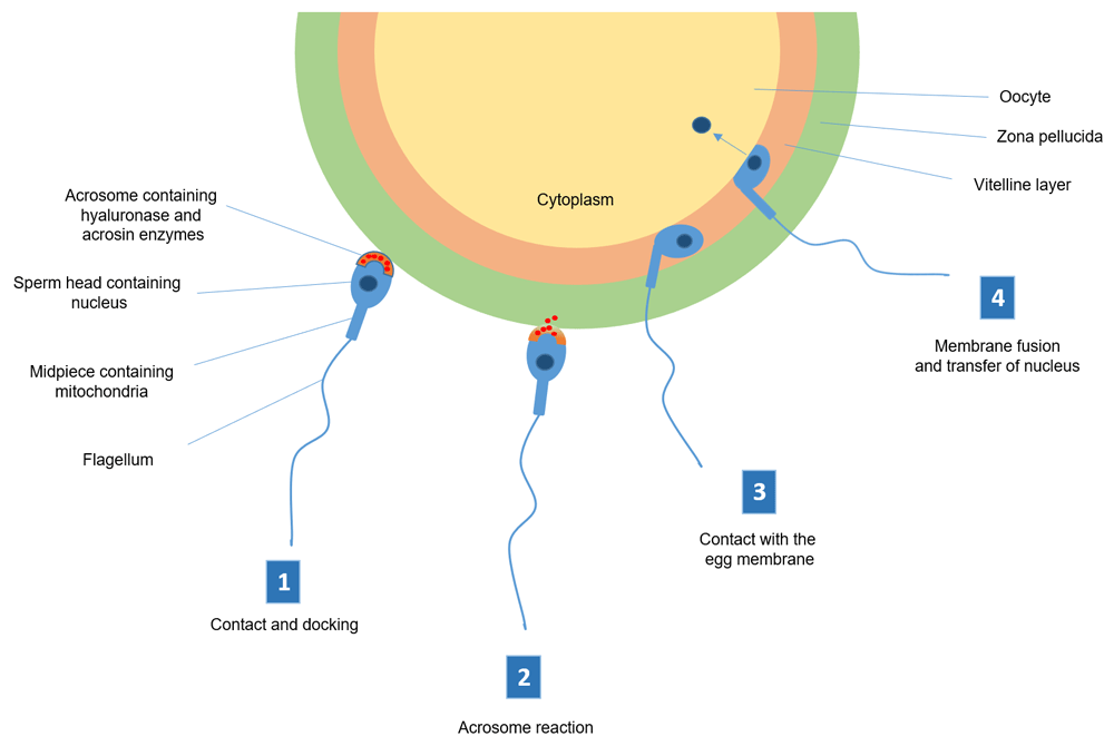 The primary function of sperm cells is to fertilize the oocyte, a task that is reliant on viability, motility and a successful acrosome reaction. The acrosome is an enzyme-filled capsule on the head of the sperm, which reacts to break down the zona pellucida of the oocyte on contact (Figure 3).