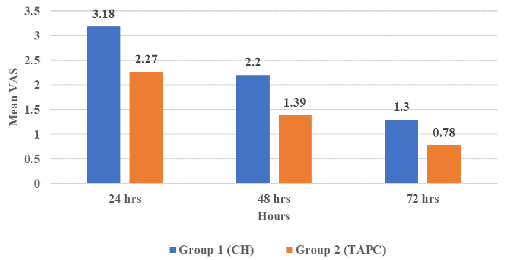 The overall highest incidence of pain values in both groups was at 24 hours postoperatively. Whereas the lowest incidence of pain values was at 72 hours postoperatively with a statistically significant difference between them (P≤0.001). The TAPC group showed statistically significant lower postoperative pain values at 48 hours only compared with the CH group (P=0.041), while at 24 and 72 hours there was no statistical significance (P=0.083 and 0.063, respectively) (Figure 1 and Table 4).