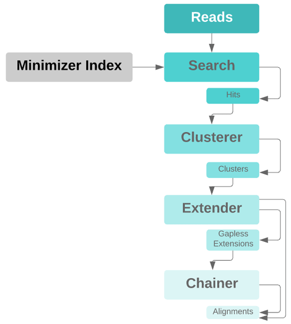 Input reads are scanned for minimizers, which are searched against a precomputed minimizer index of the graph reference. Minimizer hits for sufficiently rare minimizers are located in graph space, and the hits for all minimizers are clustered. The clusters are extended gaplessly, with a tolerance for mismatches. If a cluster produces a single full-length gapless extension, it is output as the alignment. Otherwise, partial gapless extensions are chained together by performing alignments of the intervening sequences and graph paths that connect them.