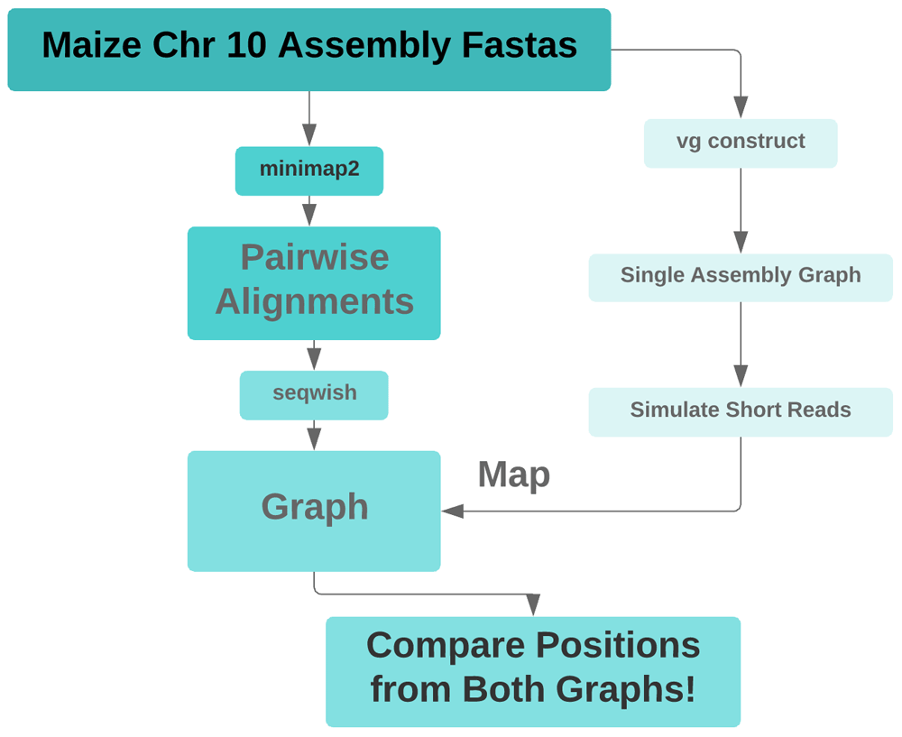 After constructing graphs with vg construct and with minimap2 and seqwish, we sought to simulate reads from the vg construct graph, align them to the minimap2/seqwish graph with our faster, better short read mapper with hit chaining, and then to evaluate the mapper’s accuracy based on the simulated reads’ original and realigned positions along corresponding positional paths in the two graphs.