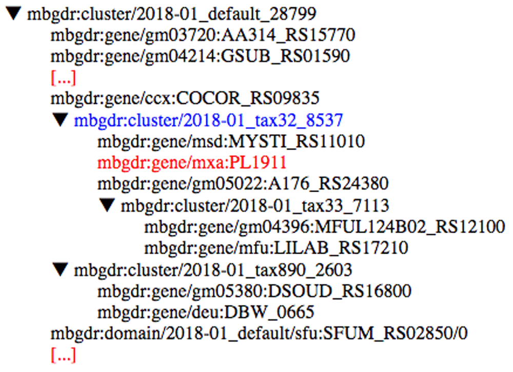Figure 1 illustrates a few of the members of a HOG, the main data structure in MBGD. In particular, this MBGD cluster has the identifier 28799. Members of an MBGD orthologous cluster can be either genes, domains or other clusters. These nested orthologous clusters are built at specific taxonomic levels in the hierarchy. For example, the cluster highlighted in blue in Figure 1 was built at taxonomic level 32, Myxococcus. The hierarchy needs to be traversed in order to reach genes, such as mxa:PL1911 that is highlighted in red in Figure 1, or domains (sub-gene level) which belong to an orthologous cluster at a given taxonomic level.