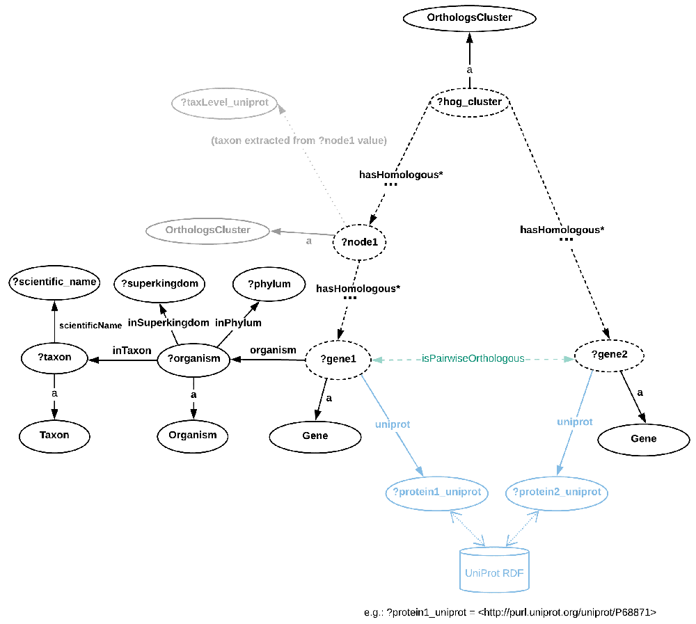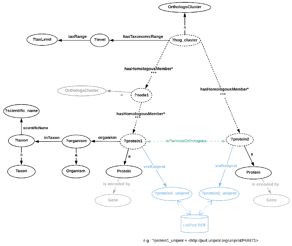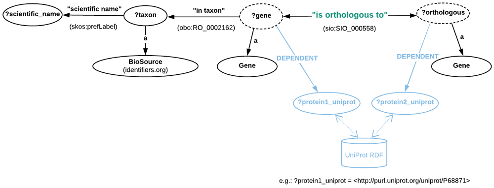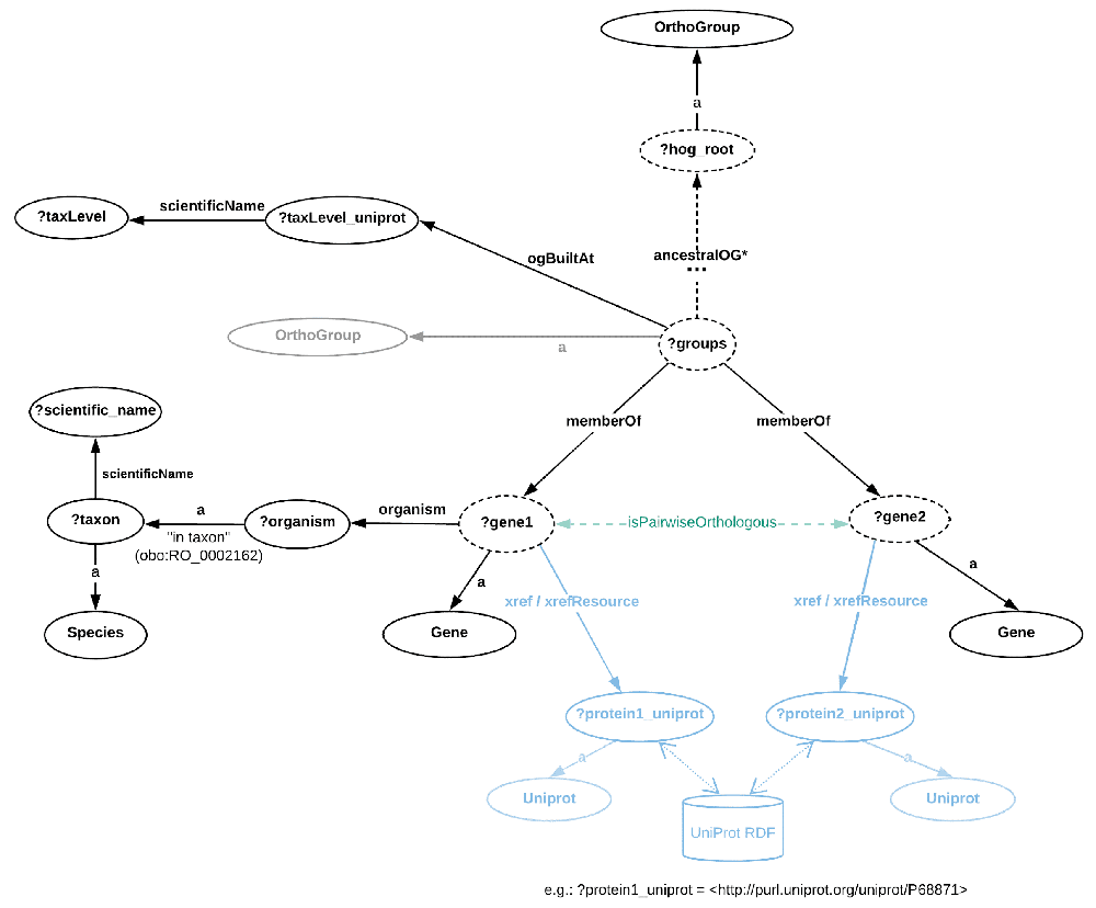 Edges are RDF properties and nodes are either classes or variables. The terms preceded by a question mark (i.e. ?) represent variables assigned with either zero or more literals or URIs. As opposed to the RDF representations in OMA and MBGD, here the pairwise orthology is explicitly asserted through the "is orthologous to" property (more precisely, http://semanticscience.org/resource/SIO_000558). However, there is no information available regarding orthologous clusters. Moreover, the Gene class here is in fact the OBO (not ORTH) class, i.e. http://purl.obolibrary.org/obo/SO_0000704. Instances of these genes can be specified either through their cross-reference to UniProt (the http://rdf.ebi.ac.uk/terms/ensembl/DEPENDENT property) or directly through their ENSEMBL identifier, by fixing the value of ?gene to the concatenation of http://rdf.ebi.ac.uk/resource/ensembl/ and the corresponding Ensembl identifier. Finally, the taxonomic identifiers are provided via instances of the BioSource class, http://www.biopax.org/release/biopax-level3.owl#BioSource.