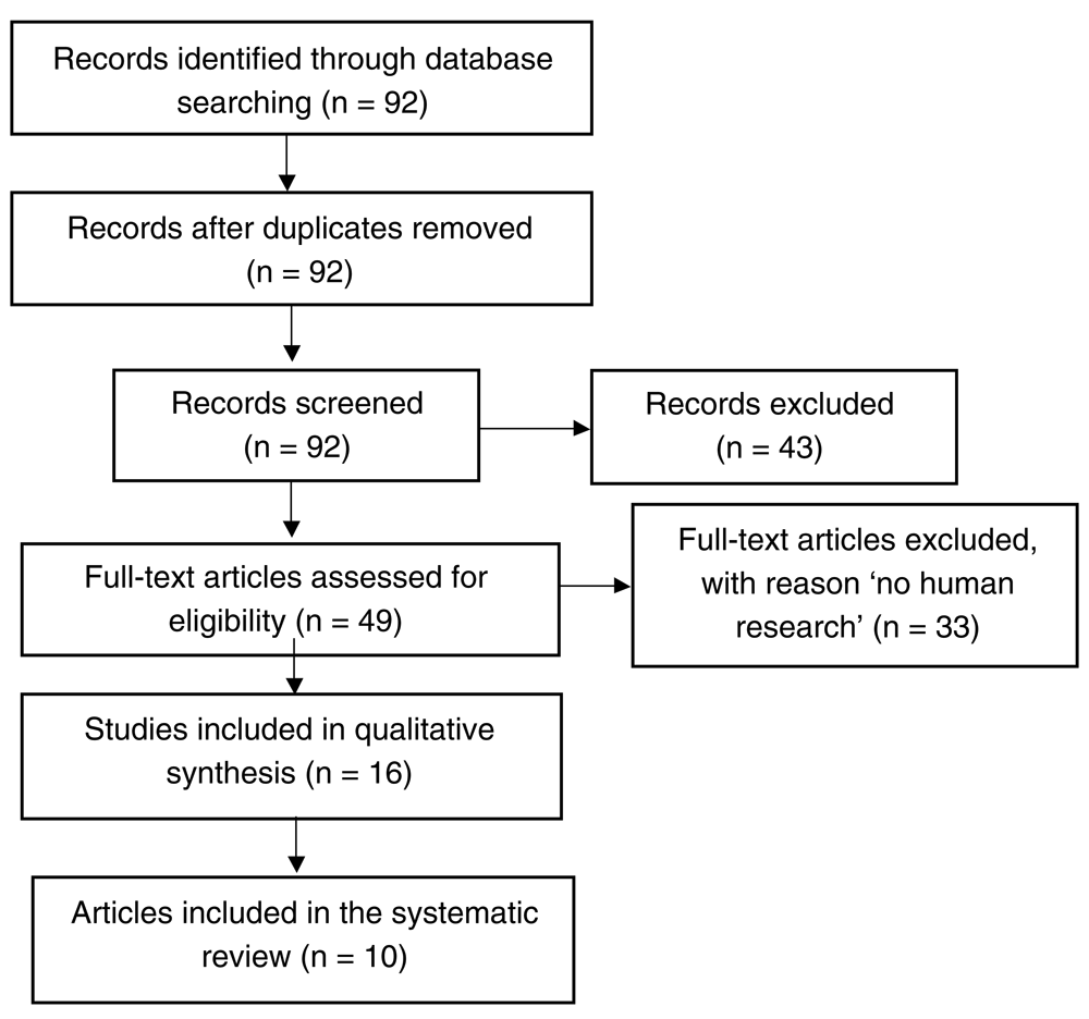 The search process resulted in 92 articles which matched the keywords. These articles were then filtered according to full text and publication year between 2011 – 2018 which resulted in 49 articles. These 49 articles were then reviewed based on titles matching the use of digital sensors (non-invasive) for early detection of risk factors for recurrent stroke and resulted in 16 articles. Finally, these 16 articles were filtered based on inclusion and exclusion criteria, (see below) and resulted in 10 articles. The search process on the databases is shown in Figure 1.