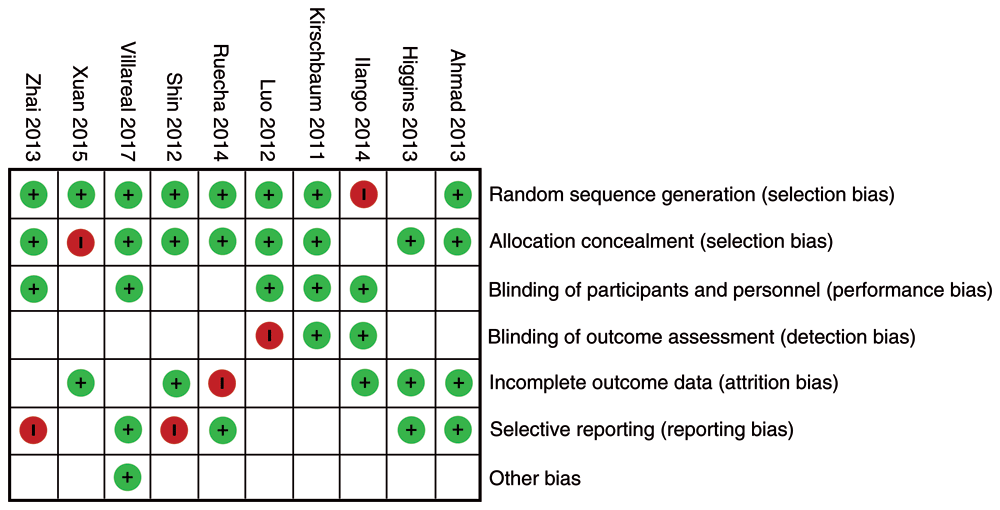 Ten articles were analyzed through data extraction. Variables acquired through data extraction were: authors name(s), year of study and publication, intervention method, and study findings. All the items were included in the table of data extraction. We used the Cochrane Collaboration free software called Review Manager (RevMan version 5.3)8 which is useful for analyzing results and generating forest plots and risk-of-bias. The results of bias assesed are shown in Figure 2.