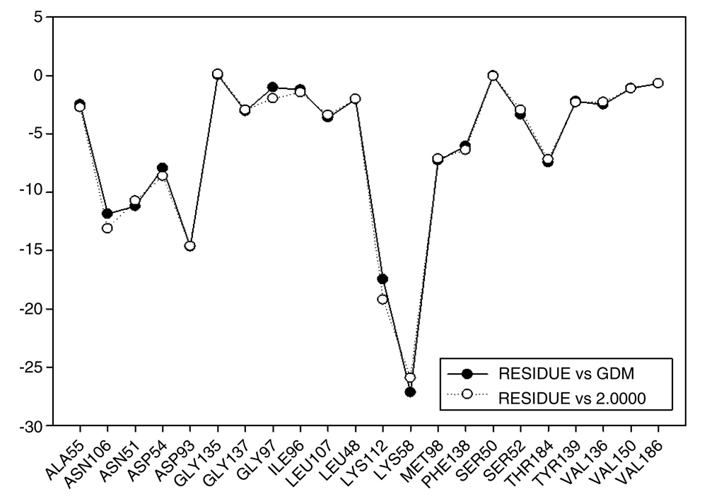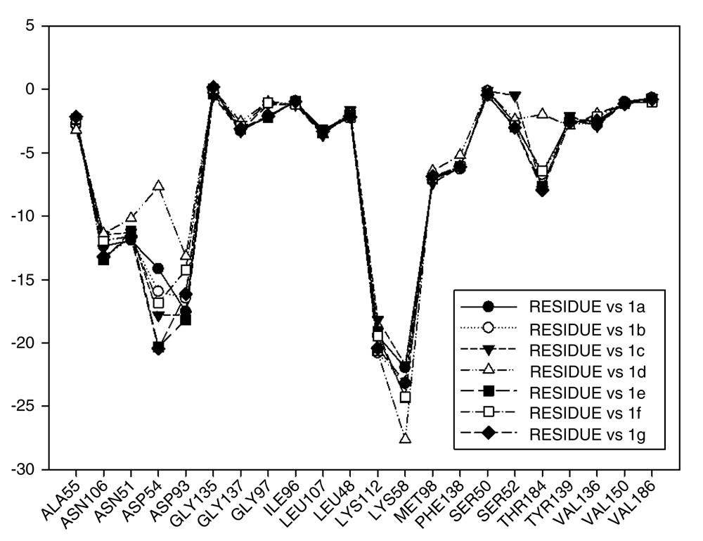 While the results of the 3DQSAR were clear, they did not fulfill expectations, because they cannot explain, in all cases, the behavior between structure-activity. For this reason, the energy of interaction (I.E) residue-ligand was calculated. In order to observe the activity within the active site of Hsp90, once this was bonded to the geldanamycin analogues an accurate analysis of the interactions ligand (substituents)-receptor could be obtained. In Figure 7, the interaction energies obtained for geldanamycin have been plotted.