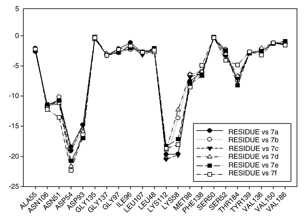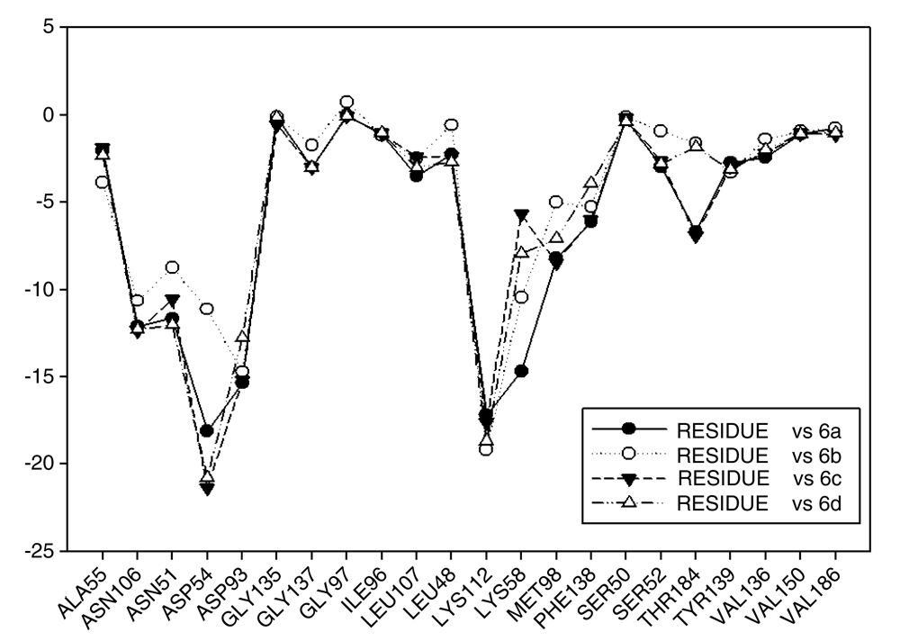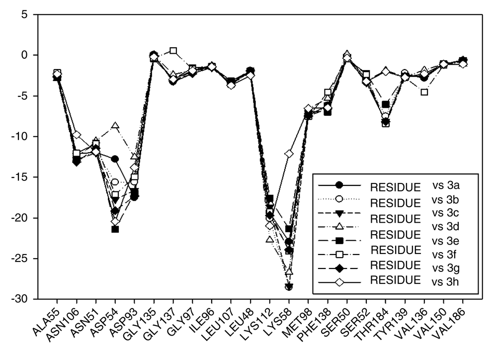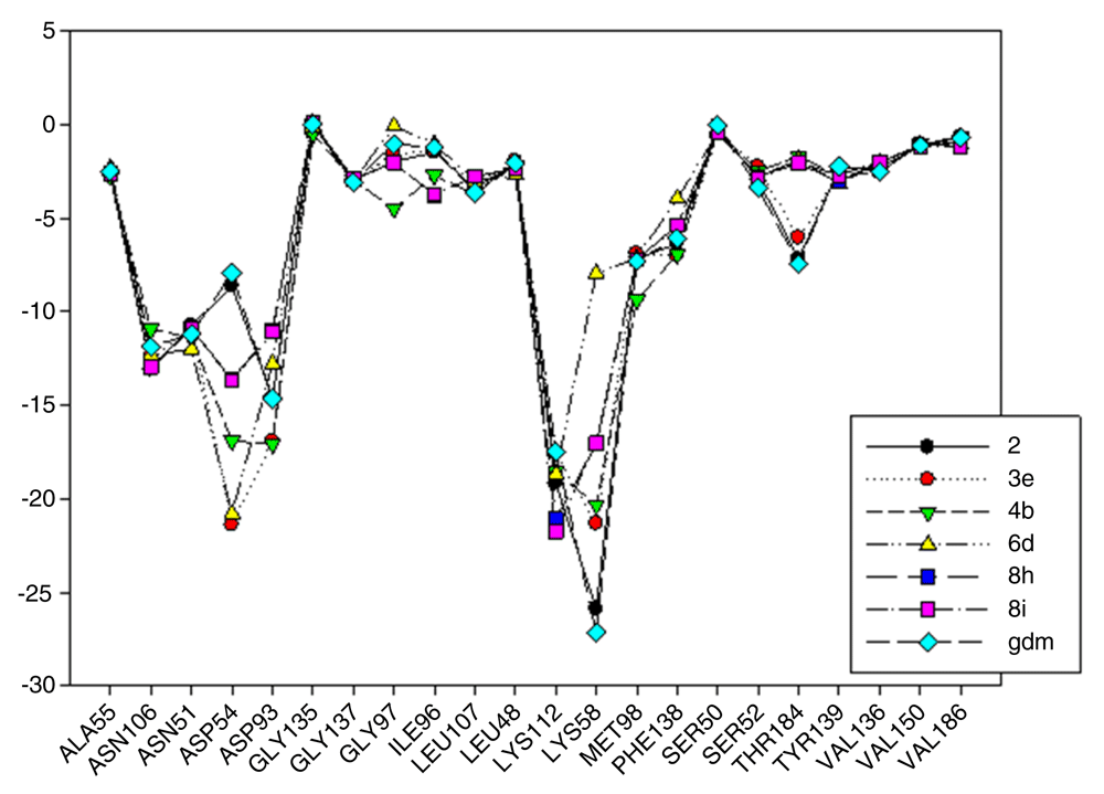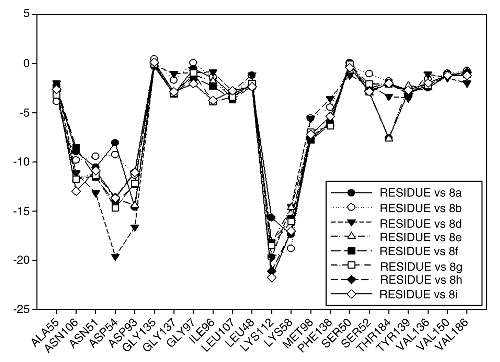 In Figure 9, interaction energies for the composite 2 (pIC50= 8.04) and 3e (pIC50= 7.96) have been plotted. 4b (pIC50 = 6.96), 6d (pIC50= 7), 8i (pIC50= 5.6) and 8h (pIC50= 5.57) present high, medium and low activities, respectively, like their predecessor.