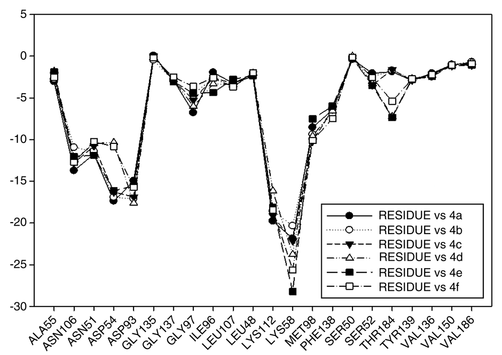 In Figure 12 the values of I.E for 11-O-acyl geldanamycin analogues have been plotted, which show the trend seen in the two previous series, since most of these compounds loses the interactions with Gly97 and Ile96 residues, and the values of I.E for Asp54 residue are similar to the Asp93. However, the trend of significant values of I.E for Lys58 as observed in previous cases is the same. The behavior observed in this series can be associated to the steric impediment of the substituents on C-11 and C-17, which impedes the formation of hydrogen bridges with Lys58 and Asp54 residues. On the other hand, as explained above, the steric impediment in these molecules induced a change, which involves the regrouping of these residues on the active site, and thus, these have to stabilize through the formation of new interactions with other residues such as Gly97 and Ile96. Also in Figure 12, it can be observed that for analogues of this series, despite having bulky groups in C-11, the interaction with Lys58 remains the highest, which suggests that the interaction with this residue has a high relevance to these analogues, and that to increase the interaction decreases the interaction with Asp54. It is of note that the analogues that cannot make a bridge of hydrogen to Asp54 have a low I.E value, as was observed with 4e and 4d analogues, which possess a methoxy group on C-17. Moreover, the non-formation of a hydrogen bond creates repulsion between oxygen atom and carboxyl group of this residue. In general, this series highlights that Lys58 acts as a "critical" residue and that to some extent it can affect the activity of these compounds7,49.