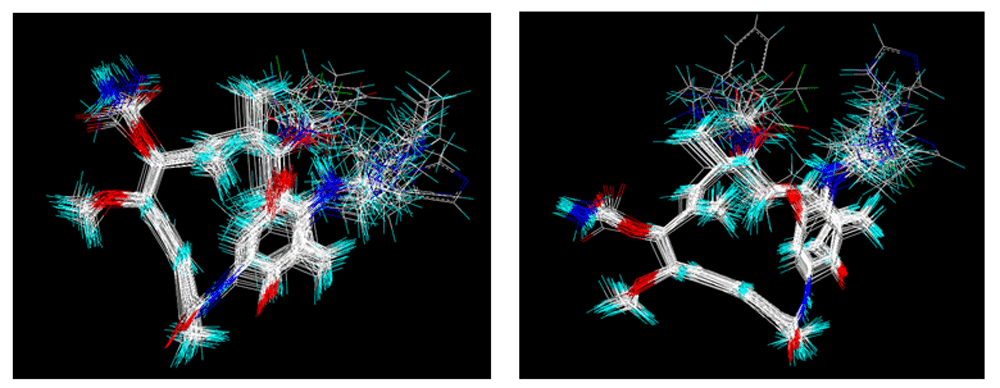 Optimization of structures. Once the design of the structures for the geldanamycin analogues was completed, short molecular dynamics were performed. The macrocycle in all analogues were left rigid, as this did not lose its bioactive configuration (Figure 3). The dynamics conditions were MM3 force field, 350 K, 5 ps of heating and 30ps of duration. Then, the conformations with lower energy were selected and carried out to partial optimization, using semi empirical approach PM6 method implemented to MOPAC 200923.