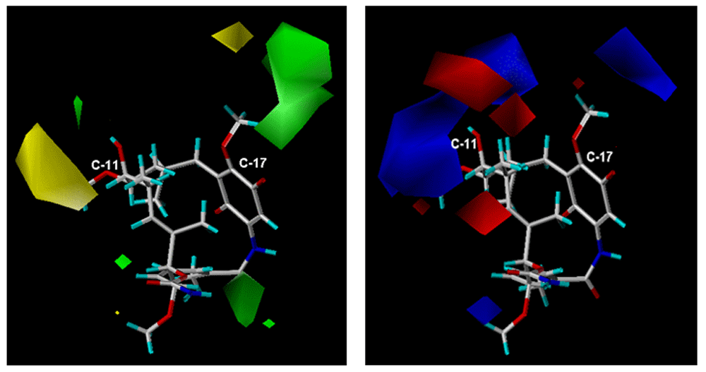 In Figure 6a and 6b, steric and electrostatic contours are depicted. These contours are located in a special way on positions C-11 and C-17 macrocycle, this is expected because these are the positions where the structural differences of the geldanamycin analogues occur.