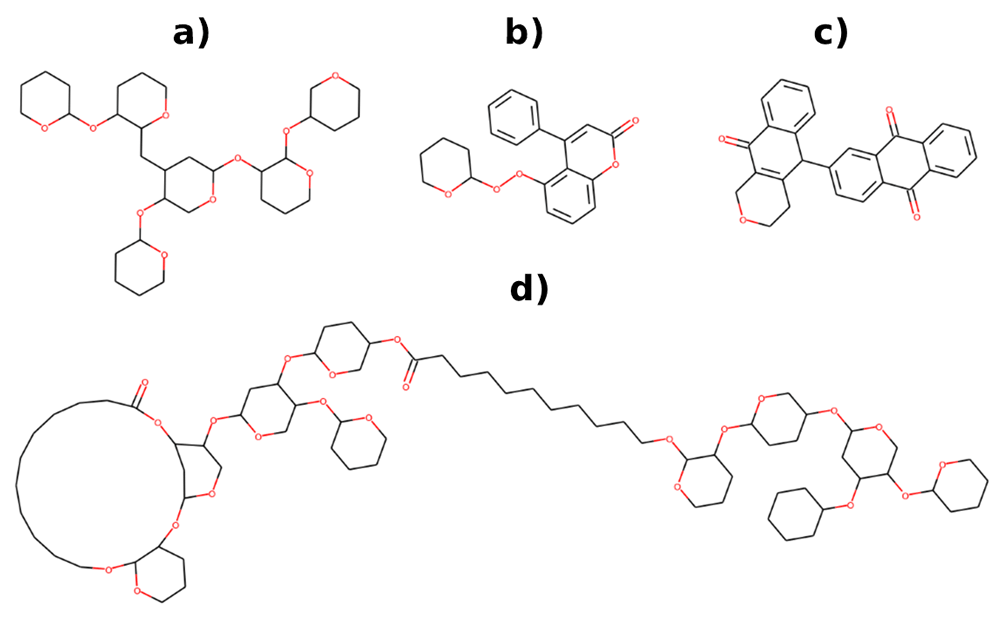 To assess the chemical space not covered by ChEMBL and NPs but by BIOFACQUIM, we characterized the structural content of the three datasets in terms of unique compounds, scaffolds and functional groups and determined the overlap among them. Figure 1 depicts Venn diagrams showing the overlap among those datasets. It should be noted that despite its small size in comparison with ChEMBL and NPs, 15.7% of compounds present in BIOFACQUIM have not been reported in those other major datasets, as well as 11.6% of its scaffolds. Figure 2 shows the structure of representative scaffolds identified in at least 2 compounds from BIOFACQUIM, all of them associated to compounds isolated from different plants. Scaffold a associated to hexasaccharides of convolvulinic and jalapinolic acids isolated from Ipomoea purga20, scaffold b corresponding to glycosides of 4-phenylcoumarin isolated from Exostema caribaeum21, scaffold c representing karwinaphthopyranones A2 and B3 isolated from Karwinskia parvifolia22 and scaffold d associated to batatins X and XI isolated from Ipomoea batatas23. Another remarkable observation is the fact that most of the overlap of BIOFACQUIM with the other datasets involves NPs, either alone or in combination with ChEMBL, being 79.9%, 85.3%, and 100% for compounds, scaffolds and FGs, respectively.