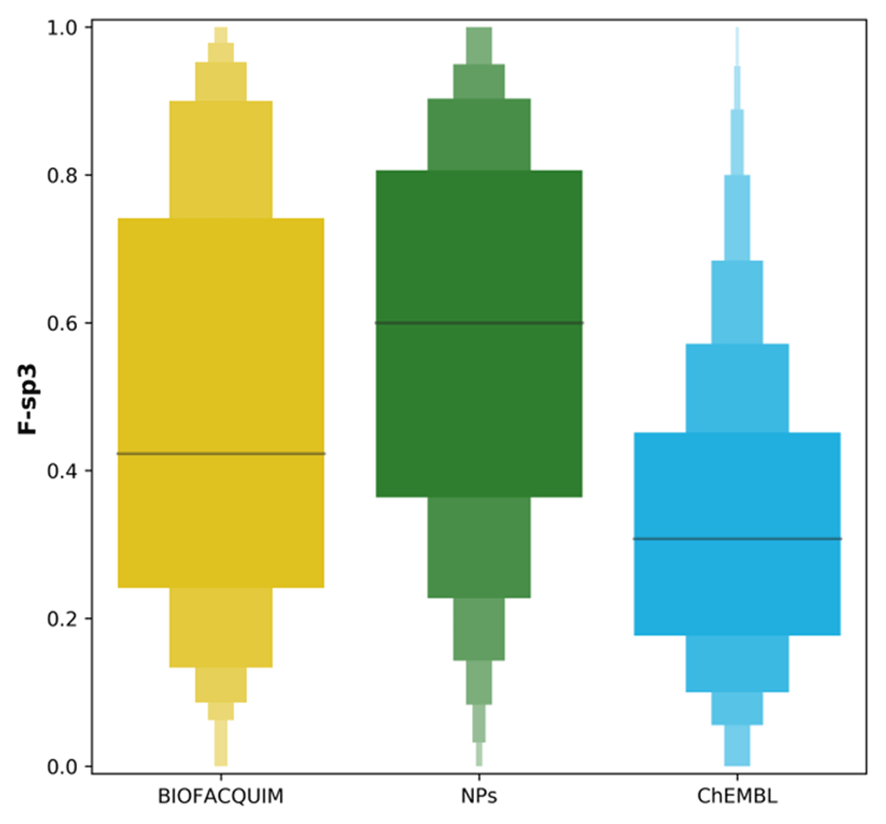 The fraction of carbon atoms that are sp3 hybridized (F-sp3) is a common metric to quantify molecular complexity12. Higher values for this descriptor have been associated to an improved binding selectivity of compounds13. In order to compare the complexity of BIOFACQUIM with the data sets selected as reference, we computed the F-sp3, as implemented in RDKit, for all compounds in the three data sets and compared its distribution among libraries.