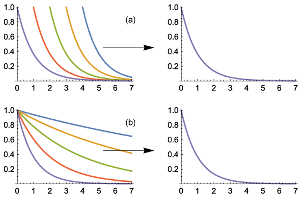 (a) The left panel shows e–(x+a) for a = 0, –1, . . . , –4. Decreasing values of a shift the curve to the right, which is equivalent to shifting the x axis by resetting the zero point. For probability patterns, the total probability must be normalized to one, which means that all curves must have the same area under the curve for values of x between 0 and ∞. To normalize the curves, the right panel plots kae–(x +a) with ka = ea. Thus, all curves become e–x invariantly with respect to different shift values, a. (b) The left panel shows e–bx for b = 20, 2–1, . . . , 2–4. Decreasing values of b stretch the x axis by a factor of 2 for each halving of b. To normalize the average value of each probability curve to be the same, the right panel shows e–λbbx for λb = 1/b. Thus, all curves become e–x invariantly with respect to different stretch values, b.