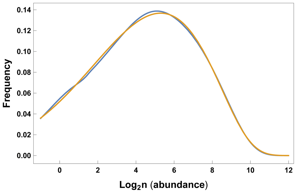 The neutral theory fit to the data comes from Chisholm & Pacala’s30 analysis in their Figure 1. They used Hubbell’s neutral theory model with parameters J = 21,060, m = 0.075, and θ = 52.1 in their Equation 3, originally from Alonso & McKane32. The gamma-lognormal model in Equation 11 produces essentially the identical pattern with parameters λ = 0.00205, a = 0.491, and α = 0.0559. The abundance scale can be expressed equivalently on the process scale, log2n = r/ log 2. See the Zenodo record33 for the calculations used to produce this plot.