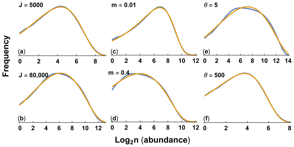 The blue curve for the neutral theory and the gold curve for the gamma-lognormal are calculated as described in Figure 3. The parameters for the neutral theory are the same as in Figure 3, except as shown in each panel. We fit the parameters for the gamma-lognormal to each neutral theory curve, with values for each panel: (a) λ = 0.01115, a = 0.4452, and α = 0.03660; (b) λ = 0.0004209, a = 0.4622, and α = 0.05014; (c) λ = 0.002765, a = 0.3182, and α = 0; (d) λ = 0.001777, a = 0.2217, and α = 0.03576; (e) λ = 0.0001509, a = 0.3851, and α = 0.03667; (f) λ = 0.02519, a = 0.3726, and α = 0.006900. See the Zenodo record33 for the calculations used to produce these plots.