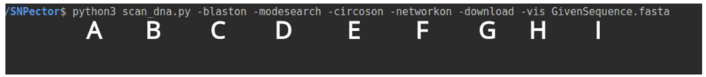 To achive maximum user-freindly usage, SNPector can be run and controlled by command line. SNPector command line structure (Figure 2) is as follows: A) Python3 compiler; B) scan_dna.py: program main script that contain all functions; C) -blaston / -blastoff: in order to initiate BLAST process to provide sequence alignment against the genome to locate where the sequence is situated, if the -blastoff is chosen it will use previous BLAST results; D) -modescan: to scan the given sequence and find out whether SNP occurs or exists in sequence or not, and -modesearch: to extract all SNPs occur in this range of sequence regardless they are exist or not; E) -circoson: draws a Circos figure to illustrate where SNPs with same properties/effect are located; F) -networkon: in order to link between SNPs, diseases and drugs and produces network HTML file; G) -download: activates the API to download data for identified SNPs from LDlink database; H) -vis: produces different figures and plots; I) GivenSequence.fasta: Tte user-provided sequence in FASTA file format. Any of the previous parameters can be deactivated when replaced with -off.