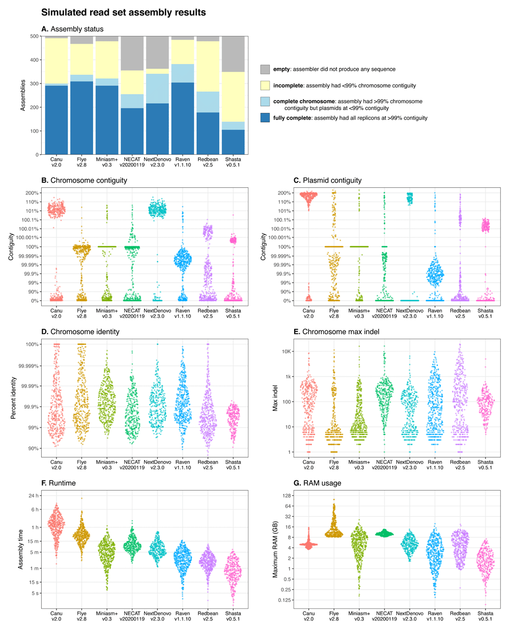Assembler resource usage is shown in terms of total runtime (Figure 1F/Figure 2F) and the maximum RAM usage during assembly (Figure 1G/Figure 2G).