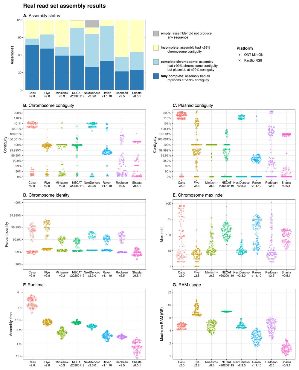 ‘Miniasm+’ here refers to the entire Miniasm/Minipolish assembly pipeline. (A) Proportion of each possible assembly outcome. (B) Relative contiguity of the chromosome for each assembly, showing cleanliness of circularisation. (C) Relative contiguity of all plasmids in the assemblies, showing cleanliness of circularisation. (D) Sequence identity of each assembly’s longest alignment to the chromosome. (E) The maximum indel error size in each assembly’s longest alignment to the chromosome. (F) Total time taken (wall time) for each assembly. (G) Maximum RAM usage for each assembly.