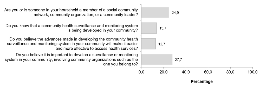 Lastly, participation in community health activities and knowledge about them were low. In all, 13.7% knew about the development of a community health monitoring system, and 27.7% considered the development of those types of spaces to be important, where different community organizations get involved (Figure 8).