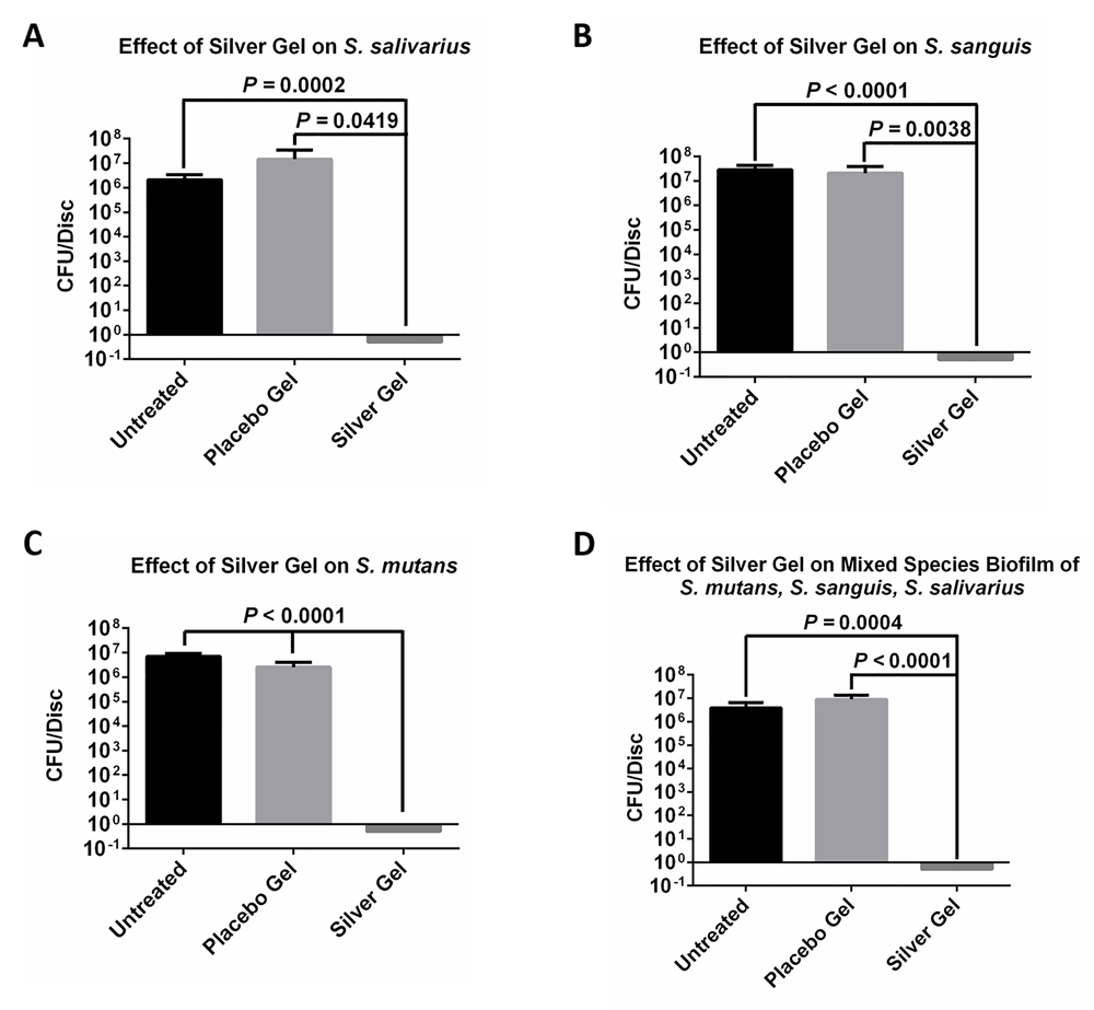 The results for the 24-h micro-aerobic in vitro studies using S. salivarius, S. sanguis, and S. mutans isolates, as well as the mixture of all three, are illustrated in Figure 1. As seen in Figure 1A–D, the cellulose discs that had no treatment, and those that were treated with the placebo gel, showed over 6 logs of bacterial growth in each case. However, the silver containing gel showed 100% inhibition (over 6 log of killing) in all cases with S. salivarius, S. sanguis, S. mutans, or the combination of all three strains, when compared with the control, as showed in Figure 1A–D. Raw data are available on OSF19.