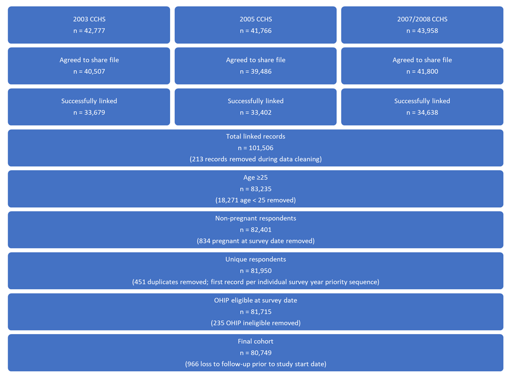 For the linked study cohort, the Ontario sample of the 2003, 2005, and 2007-2008 CCHS cycles provided 128,501 valid interviews. Of these respondents, a subset agreed to share and link their interview information and 101,506 were successfully linked to their provincial health card number using a deterministic and probabilistic algorithm. We included respondents aged 25 years and older if they were eligible for provincially funded health care and not pregnant at the time of survey administration. For individuals with multiple interviews, only the earliest interview was included. We excluded individuals who were lost to follow-up in the first year following their interview (i.e., they were not available at the beginning of the study). This resulted in a final cohort of 80,749 unique Ontario respondents (see Figure 1).