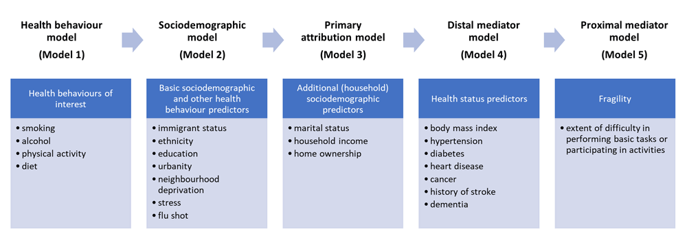 We performed three sets of sensitivity analyses. First, we created five models representing a stepwise approach to assess confounding and mediation. The five models assessed health care costs and burden estimates with progressive adjustment for risk factors: age, sex and health behaviours (Model 1), basic socio-demographic characteristics (Model 2), additional sociodemographic characteristics (Model 3), health status mediators (Model 4), and fragility measures (Model 5) (Figure 2). The estimate derived from Model 3 was assumed to be our most accurate and appropriate estimate of the attributable burden due to health behaviours. The estimates derived from Model 1 (simply age and health behaviours) and Model 5 (the over-adjusted model) were used as upper and lower bounds of uncertainty.