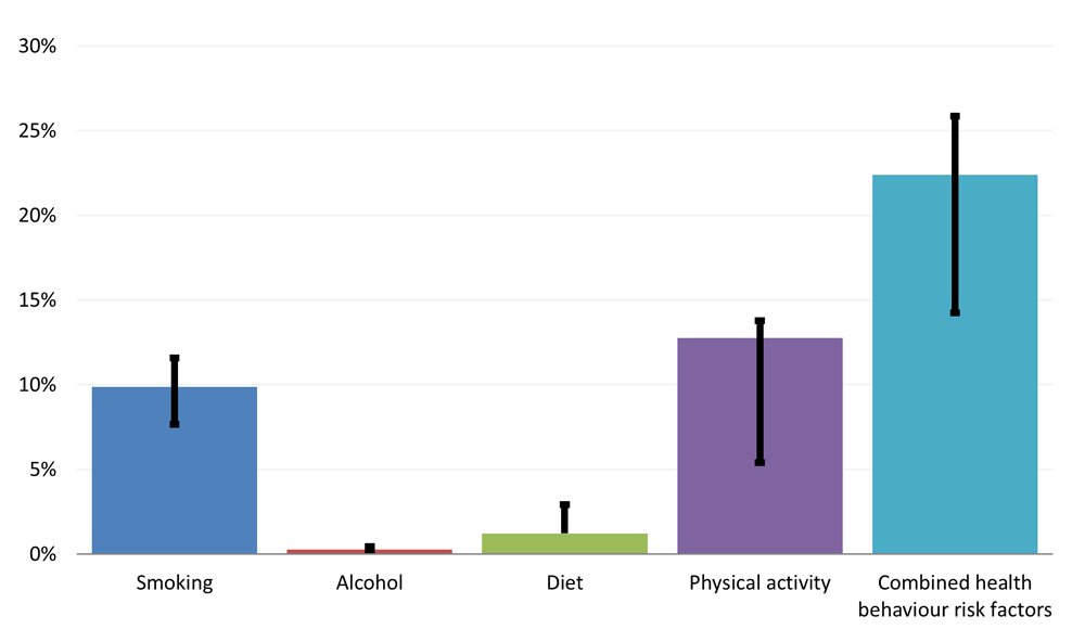 Estimates of the cost of modifiable health behaviours and socioeconomic risk factors provides evidence to allow policy-makers to prioritize interventions aimed at reducing health care costs. Our estimate of a 1.9% reduction in health care expenditure (i.e., $5 billion) through improved health behaviours, suggests that investments in promotion of healthy living have potential for substantial savings in health care costs in Canada. In our study, reduced smoking was the main contributor to avoided health behaviour attributable health care costs (accounting for 84% of the 1.9% cost reduction). This large cost reduction reflects prominent smoking prevention strategies that were introduced during the study period—including 100% smoke-free public places including restaurants25. From 2004 to 2013 there was an 11% reduction in the attributable fraction of smoking, which was solely a consequence of a reduction in the prevalence of current smoking. The large remaining burden from health behaviours and social inequalities suggests that there are significant opportunities to further reduce health care costs through population health strategies.