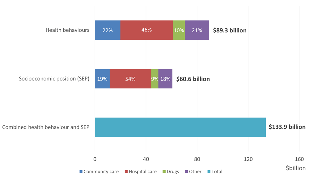 Our study shows that health behaviours and socioeconomic position contribute to a large health care cost burden. Better health and well-being is the primary goal of improving health behaviours and reducing social inequity. However, it is important to recognize that existing investments in public health also results in a large reduction in expenditure in the acute care sector, particularly hospital care. The health premium of prevention and social equity is an overlooked opportunity for a sustainable health care system.